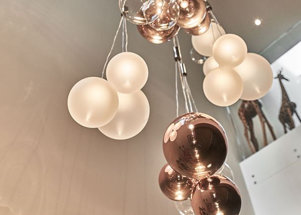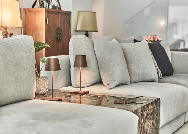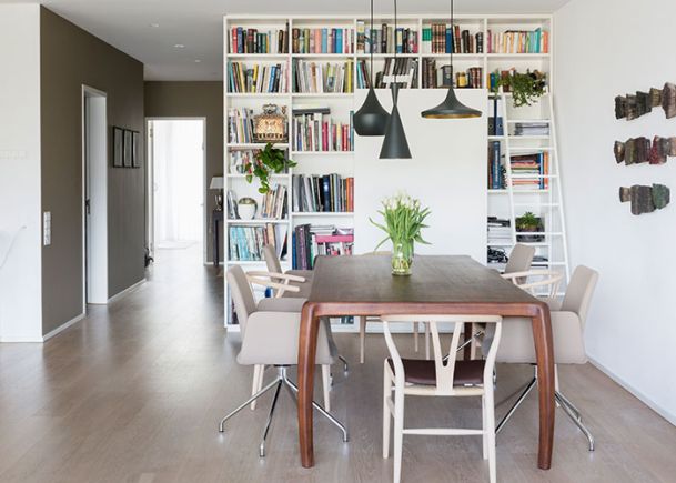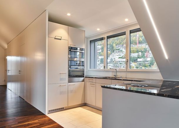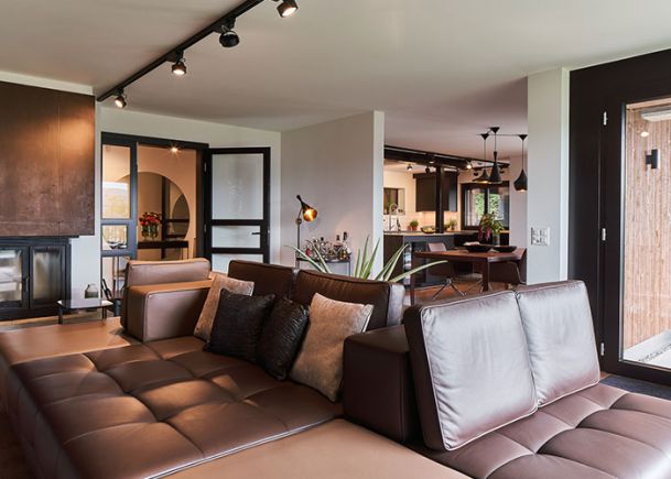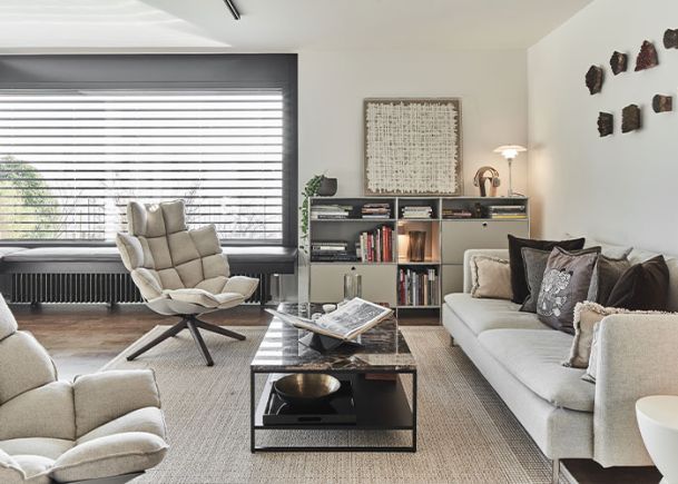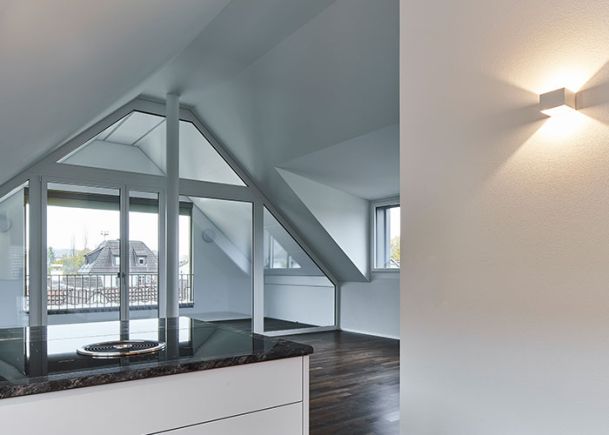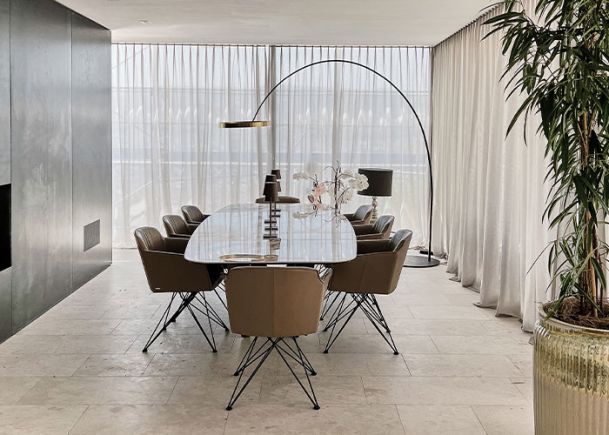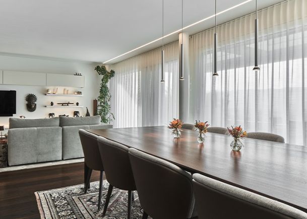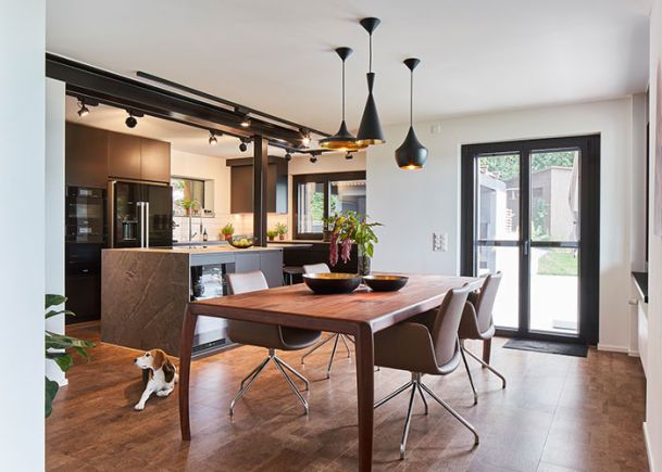 Neugestaltung Wohn- und Essbereich sowie Beleuchtung Treppenabgang Design Sofalandschaft, Esstisch